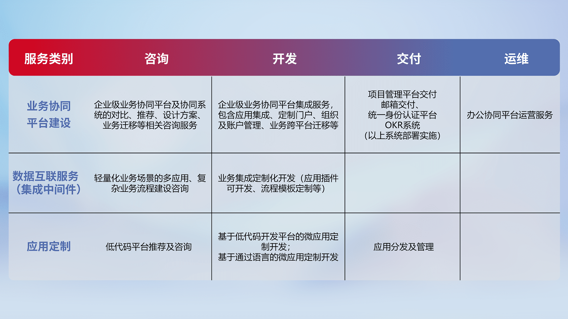针对钉钉、、企微、、IDaas等平台级产品提供产品的规划、、方案、、、、交付、、、定制化开发等服务,,,,实现如统一协同办公、、智能客户服务、、混合会议管理、、、、智能数据查询、、、、等业务场景,,,实现数字化转型。。